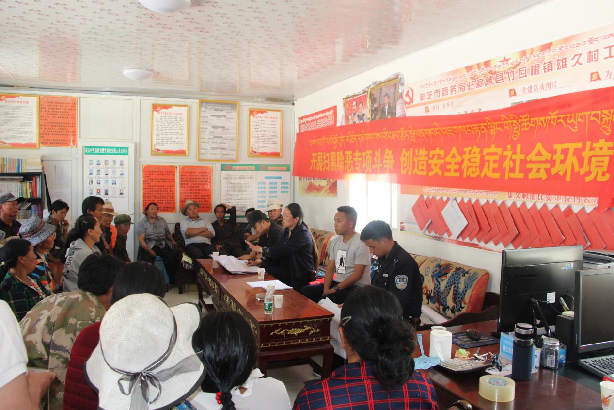 为切实把综合治理、依法治理、源头治理结合起来,有效打击黑恶势力犯罪,铲除黑恶势力滋生土壤。6月25日,由县司法局领导带队,会同县交通、公安、国土负责人一行来到雄久村进行《开展扫黑除恶专项斗争,创造安全稳定社会环境》教育活动。雄久村52名农牧民参加此次活动。
