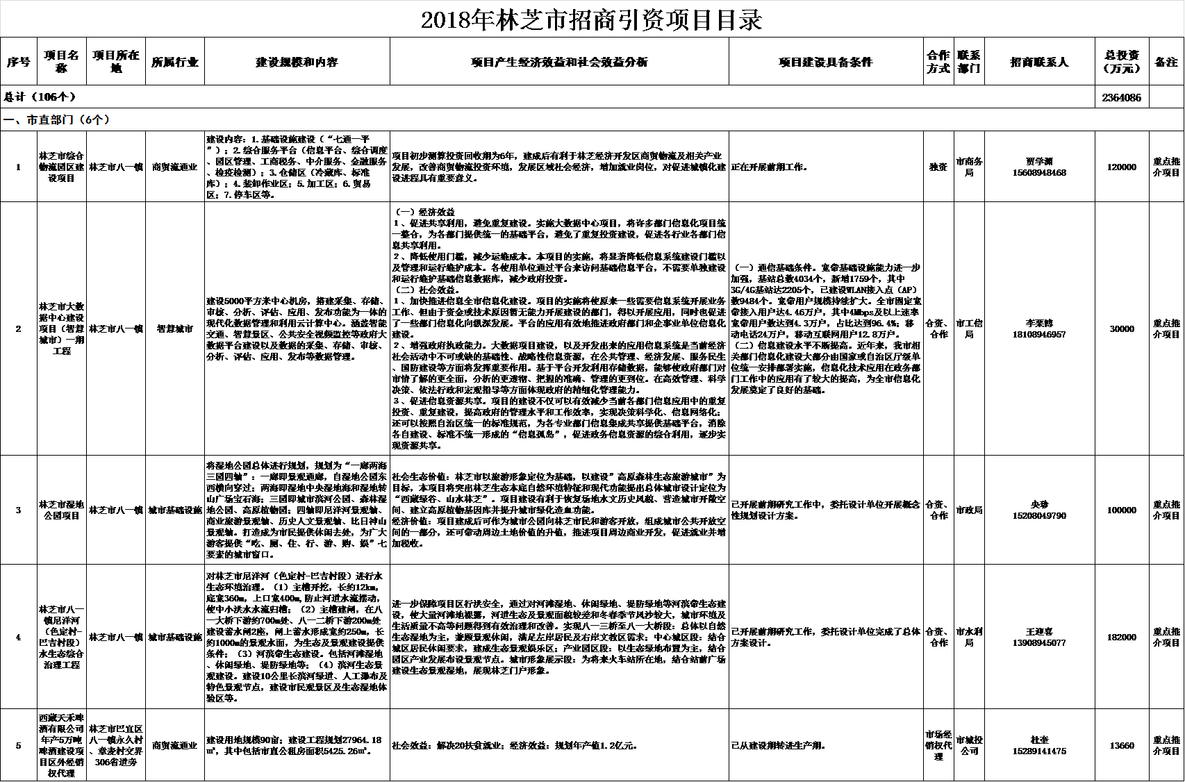 2018年林芝市招商引资项目共106个,累计投资概算236.4亿元,其中包括旅游业、高原现代农牧业、藏医药业、商贸服务业、文化产业等行业。